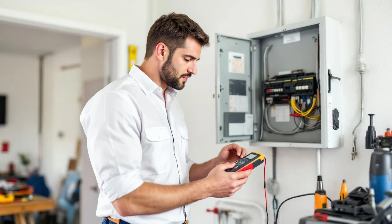 A professional home inspector is carefully examining an electrical panel using testing equipment to assess the home’s condition and identify any potential hazards. This inspection is crucial for ensuring safety and providing valuable information to homeowners and first-time buyers.